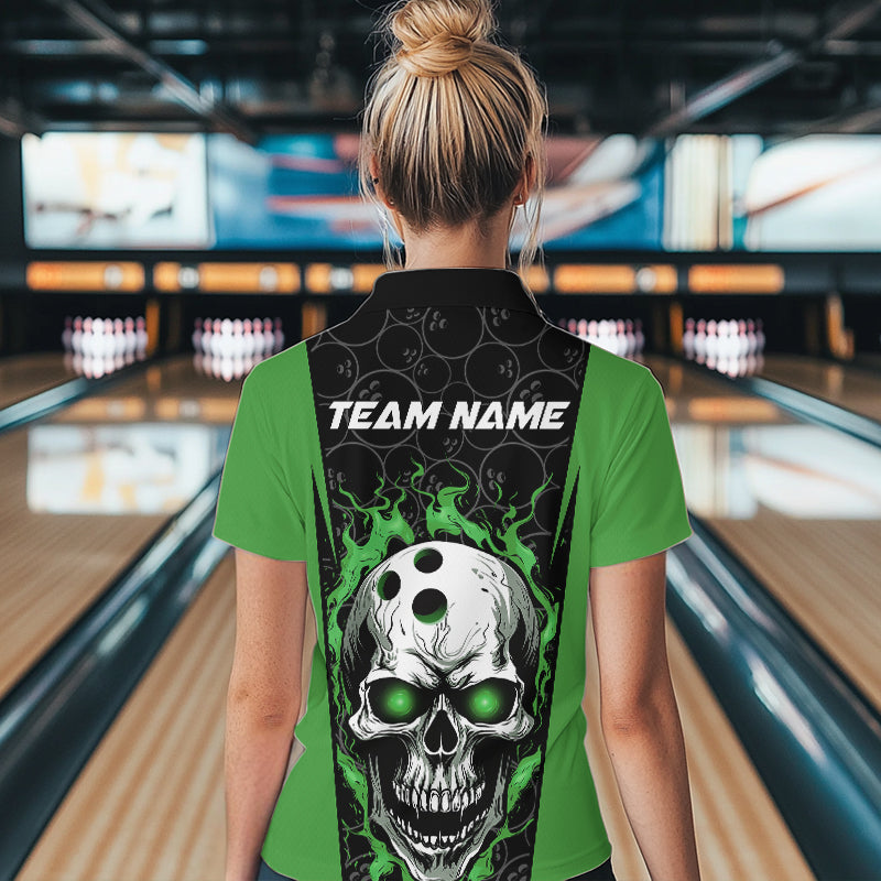 Custom Black And Green Flame Skull Bowling Womens Quarter-Zip Shirt, Fire Skull Bowling IPHW8628