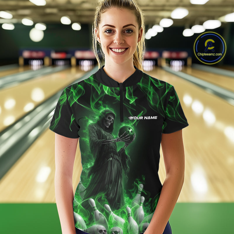 Custom Green Flame Grim Reaper Bowling Women Quarter-Zip Shirts, Halloween Bowling Outfit IPHW9731
