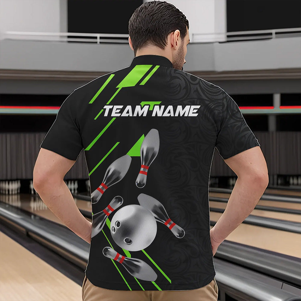Silver Bowling Ball pins Team bowling shirts for Men custom bowling Polo, Quarter zip jersey | Green NQS9628