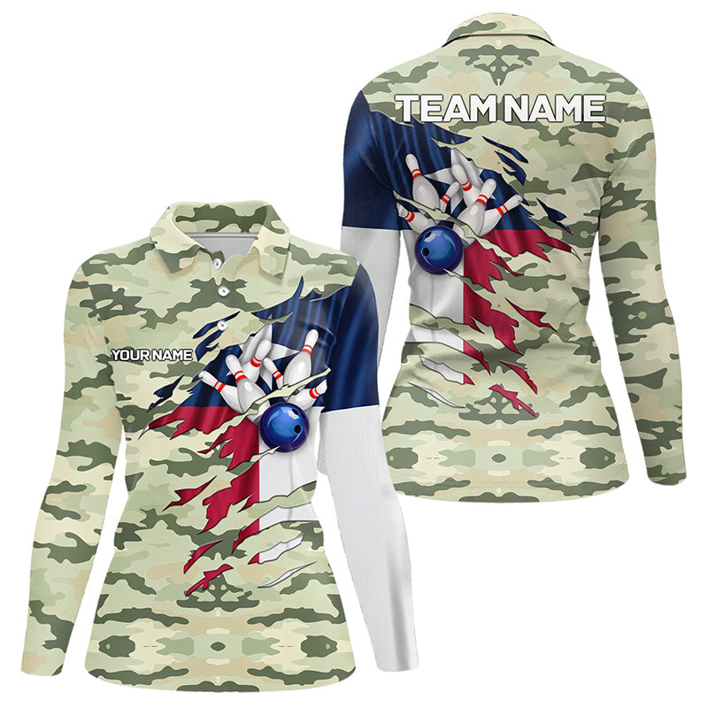 Texas Flag Green Camo Bowling Polo, Quarter Zip shirts for Women custom Texas Bowling Team Jerseys NQS9536
