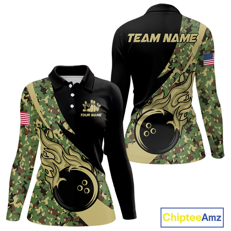 Women bowling polo, quarter zip shirts Custom green camo bowling team jerseys, gift for team Bowlers NQS10053