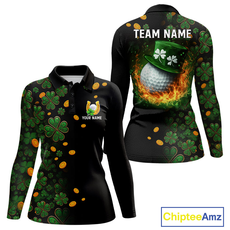 Personalized Green Clover St Patrick's Day pattern Golf Polo Shirts For Women, Best ladies golf wear NQS11207