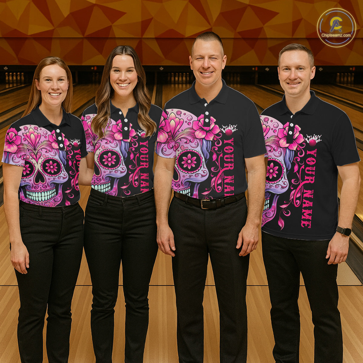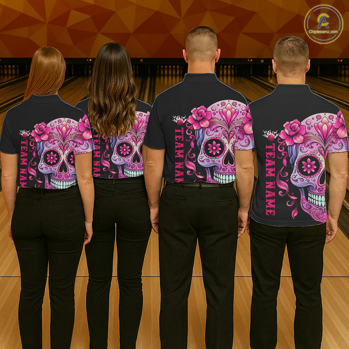 Pink Sugar Skull Tattoo Custom Unisex Team Bowling Polo Shirts, Halloween Team Bowling Jerseys IPHW5243