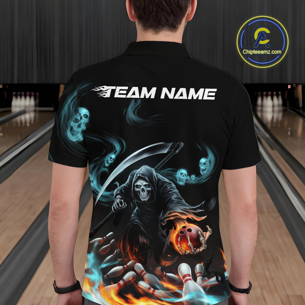 Custom Blue Skull Smoke Grim Reaper Bowling Men Polo Shirt, Halloween Bowling Jerseys IPHW9900