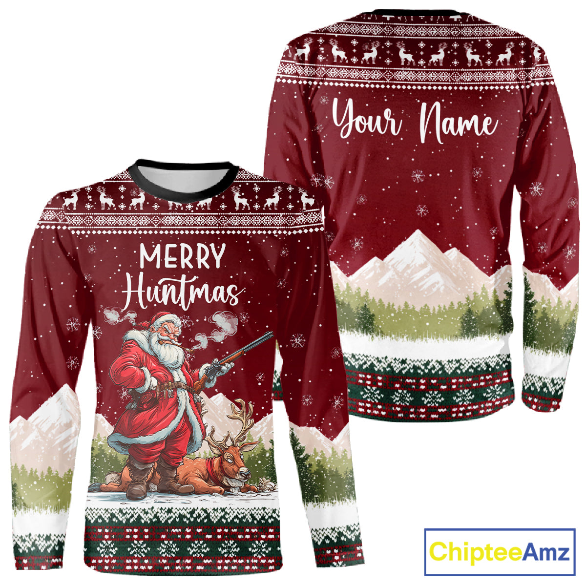 Funny Ugly Pattern Santa Deer Hunting Customized Name All Over Print Shirts, Christmas Shirt Ideas for Hunter NBT283