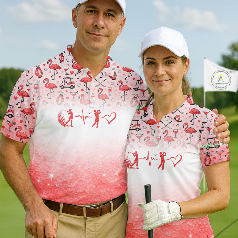 Red Flamingo Heart Theme Matching Golf Polo Shirt For Couple Custom Couple Valentines Outfit NHN0145