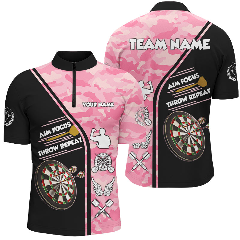 Aim Focus Throw Repeat Custom Pink Camouflage Darts Shirts For Men, Funny Saying Dart Jerseys TDM2930