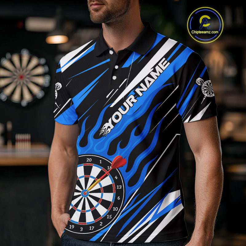 Blue Dartboard Flame Custom Dart Shirts For Men, Darts Team Jerseys Polo & Quarter Zip Shirts TDM4004