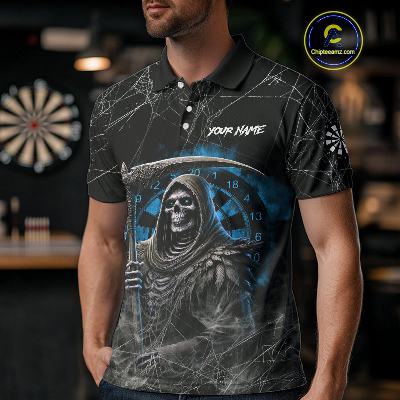 Black And Blue Grim Reaper Smoke Funny Dart Shirts For Men Custom Dart Jerseys, Darts Clothing TDM4005