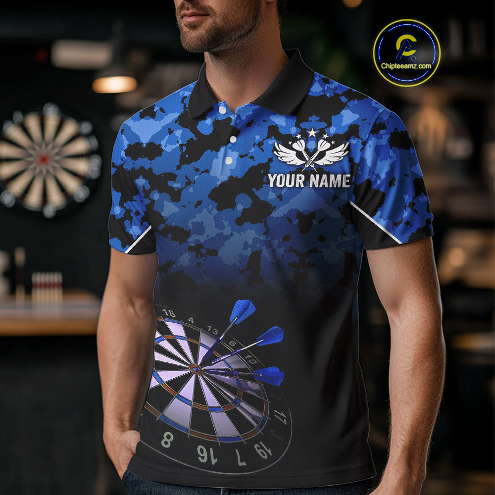 Personalized US Flag Blue Camo Dart Shirts For Men, Patriotic Darts Jersey Team Polo & 1/4 Zip TDM4128
