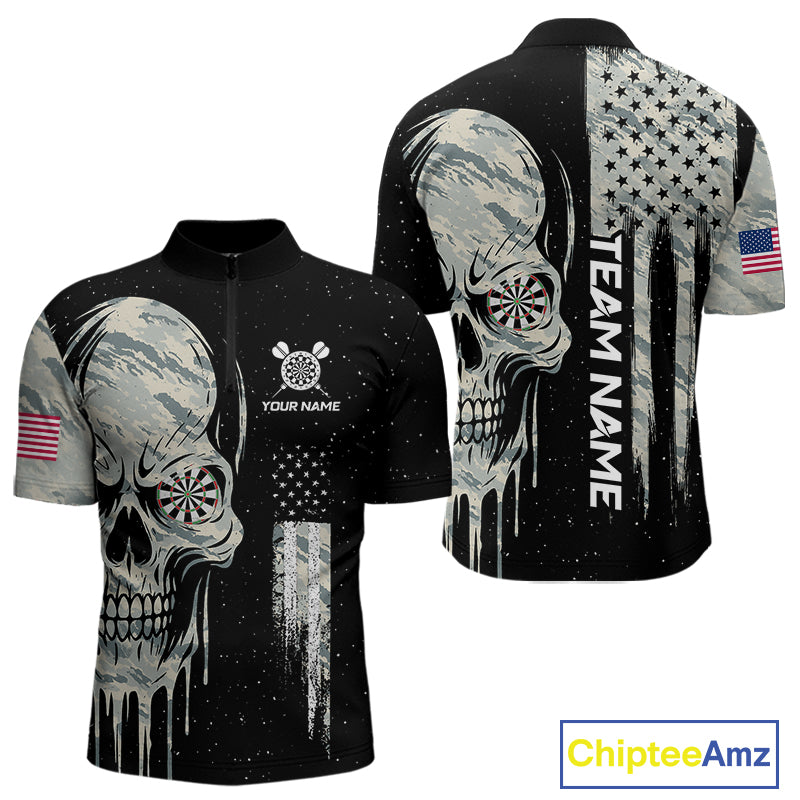 Grunge Camo Skull American Flag Dart Shirt For Men Custom Patriotic Dart Jersey Team Polo & 1/4 Zip TDM4277
