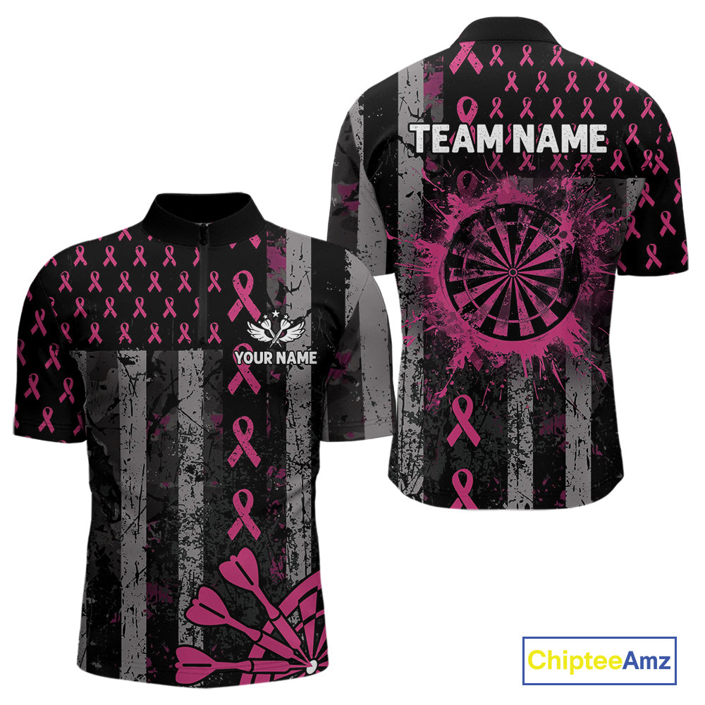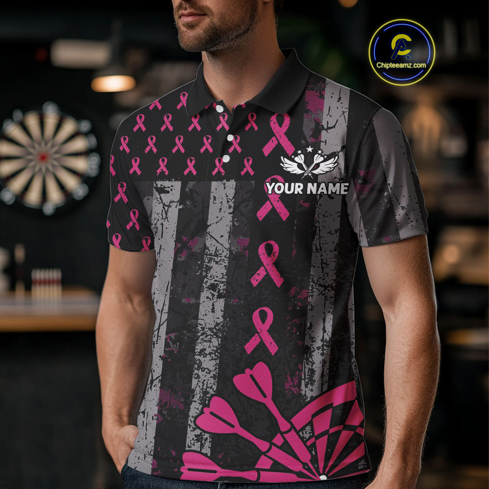 Personalized Grunge US Flag Pink Ribbon Patriotic Darts Shirt For Men, Breast Cancer Darts Jersey TDM4501