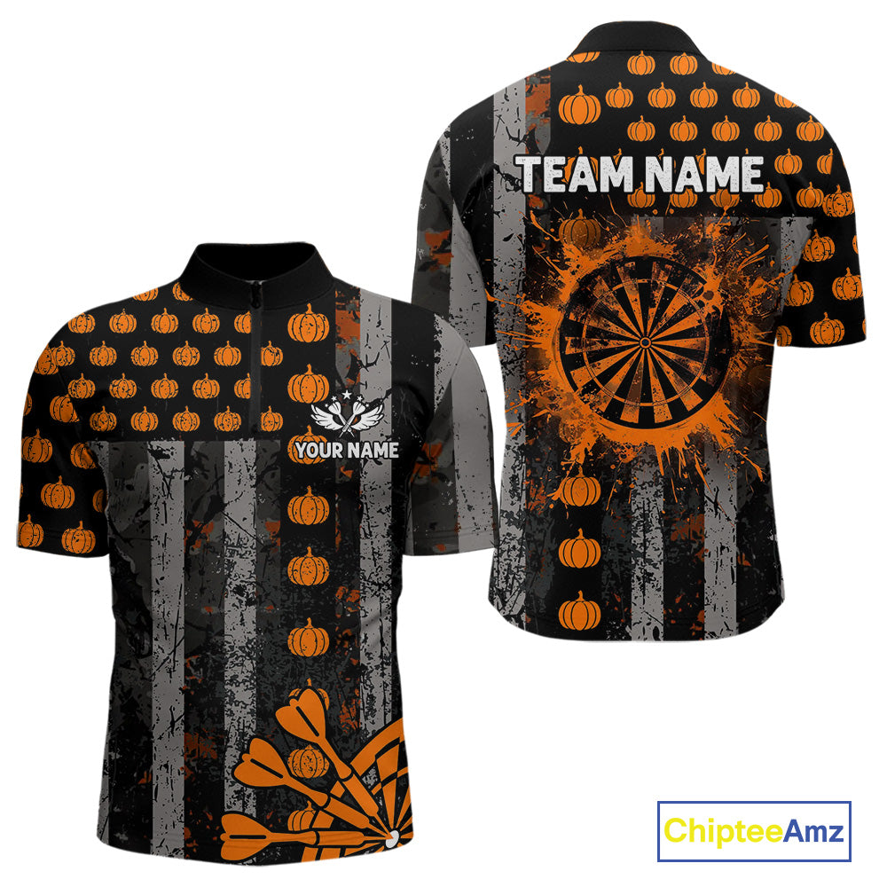Personalized Orange Grunge US Flag Pumpkin Darts Shirt For Men, Halloween Darts Jersey Outfit TDM4502