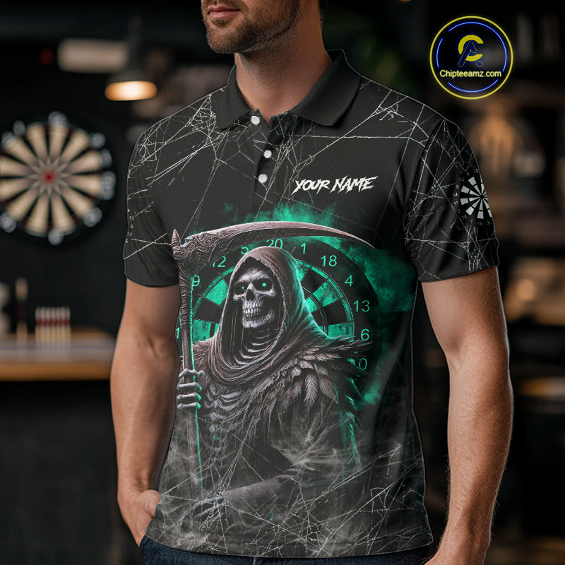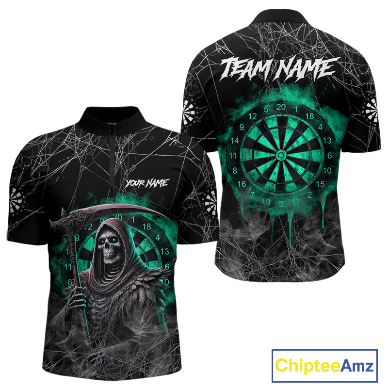 Black And Turquoise Smoke Grim Reaper Dart Shirts For Men Custom Halloween Darts Jersey Outfit TDM4590