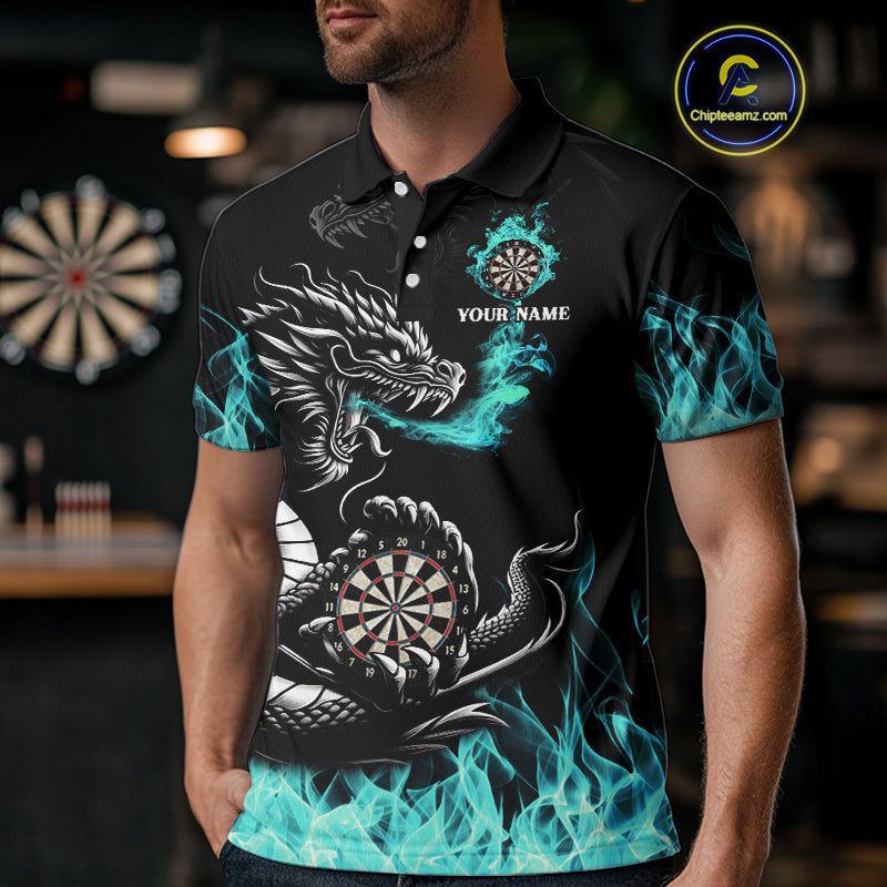 Personalized Turquoise Flaming Dragon Darts Shirt For Men Custom Darts Team Jersey Polo & 1/4 Zip TDM4592