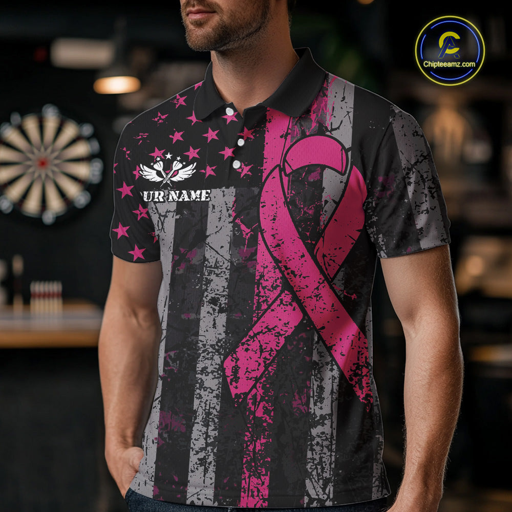 Custom Pink Ribbon Grunge American Flag Patriotic Darts Shirt For Men, Breast Cancer Darts Jersey TDM4623