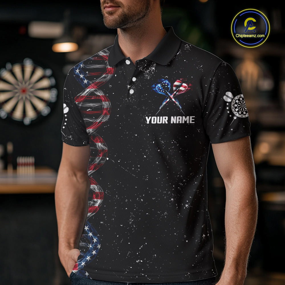 Custom Men's Black Grunge DNA American Flag Smoke Darts Shirt, Patriotic Dart Jersey Polo, 1/4 Zip TDM4628