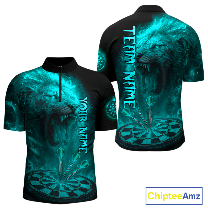 Personalized Turquoise Fire Flame Lion Darts Shirt For Men, Dart League Jersey Polo & 1/4 Zip TDM4680