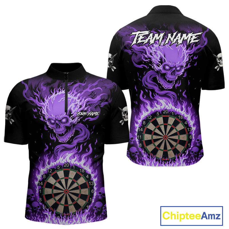 Purple Flaming Skull Darts Shirt For Men Custom Darts Jersey Team Polo & Quarter Zip TDM5056