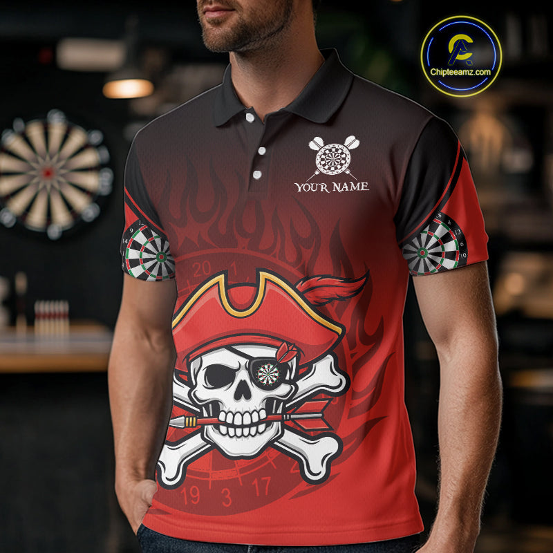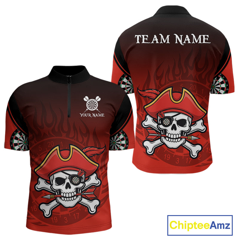 Red Black Funny Pirate Flame Skull Darts Shirt For Men Custom Dart Jerseys Team Polo & 1/4 Zip TDM5177