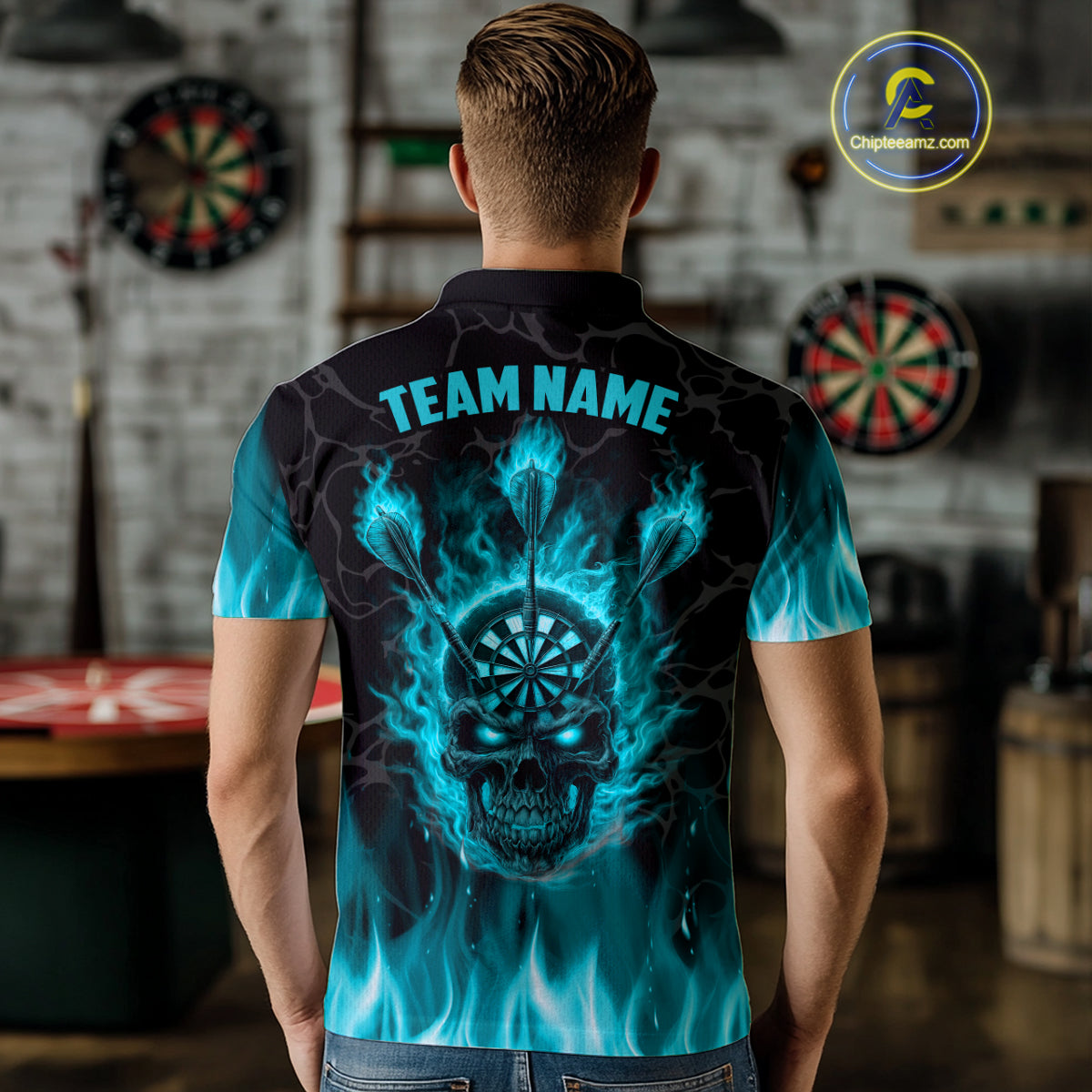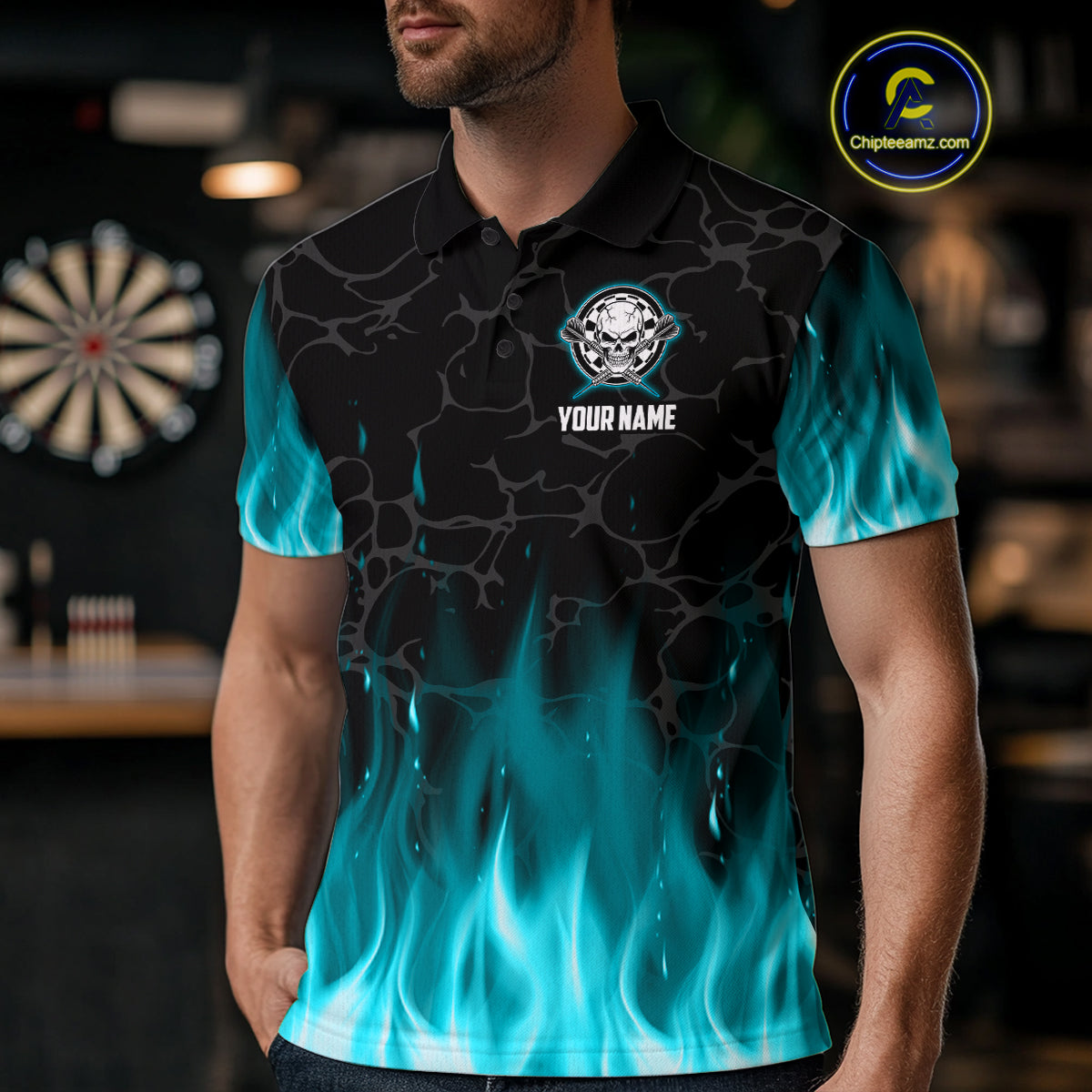 Fire Flame Skull Darts Polo & Quarter Zip Custom Darts Shirts For Men, Darts Team Jersey|Turquoise TDM5320