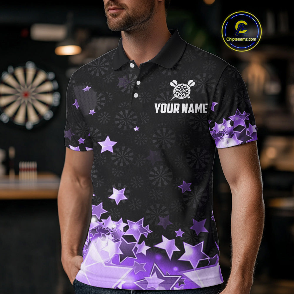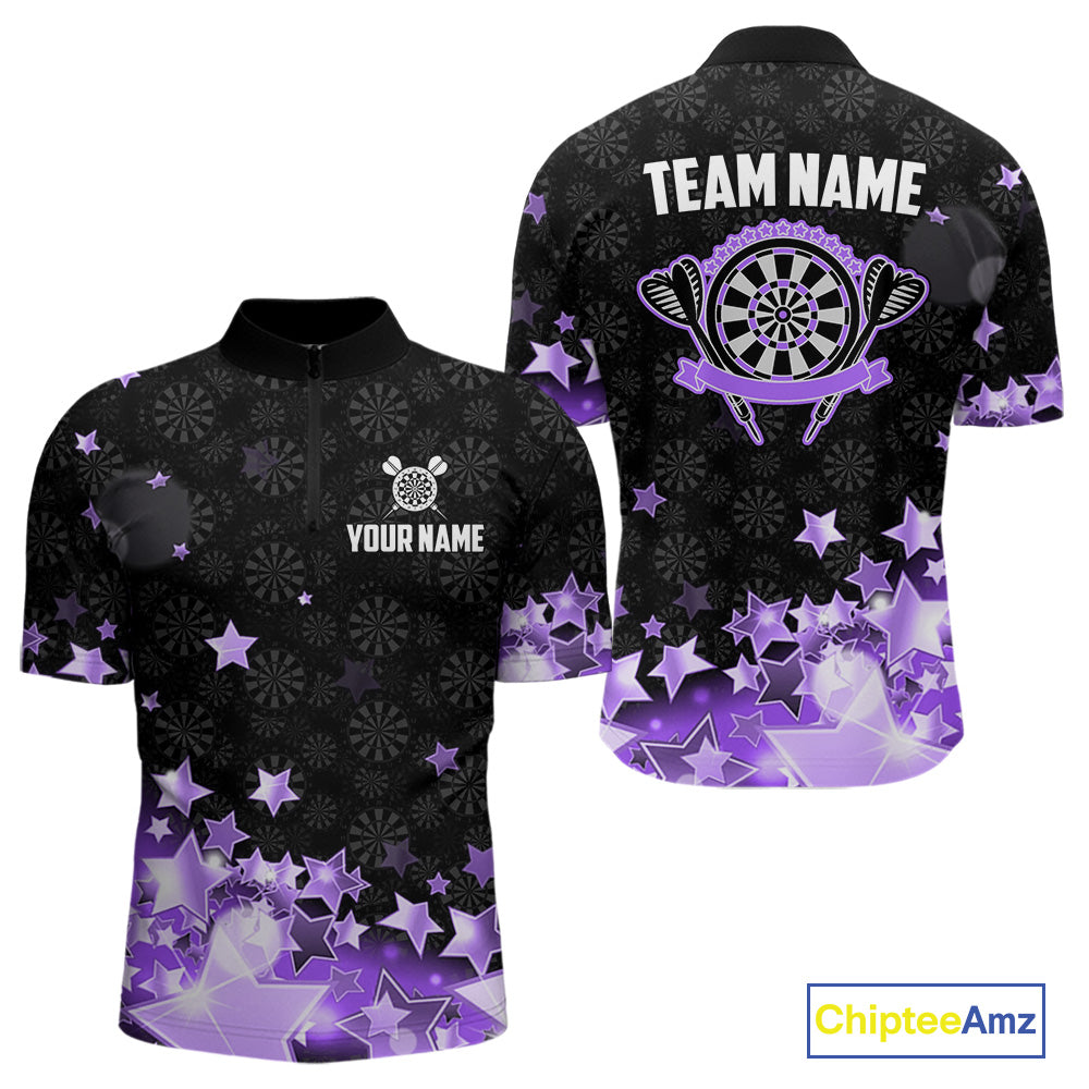 Funny Custom Dart Shirt For Men, Black And Purple Glowing Star Pattern Darts Polo & Quarter Zip TDM5326
