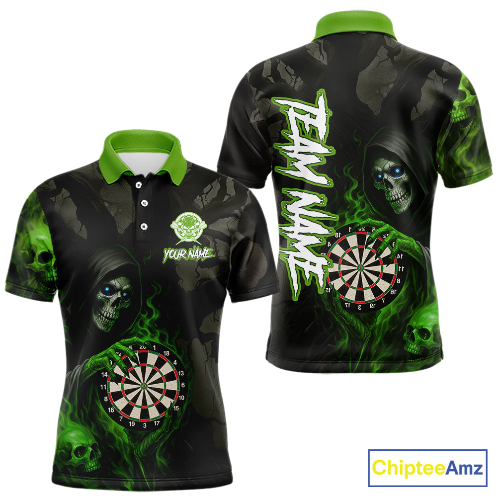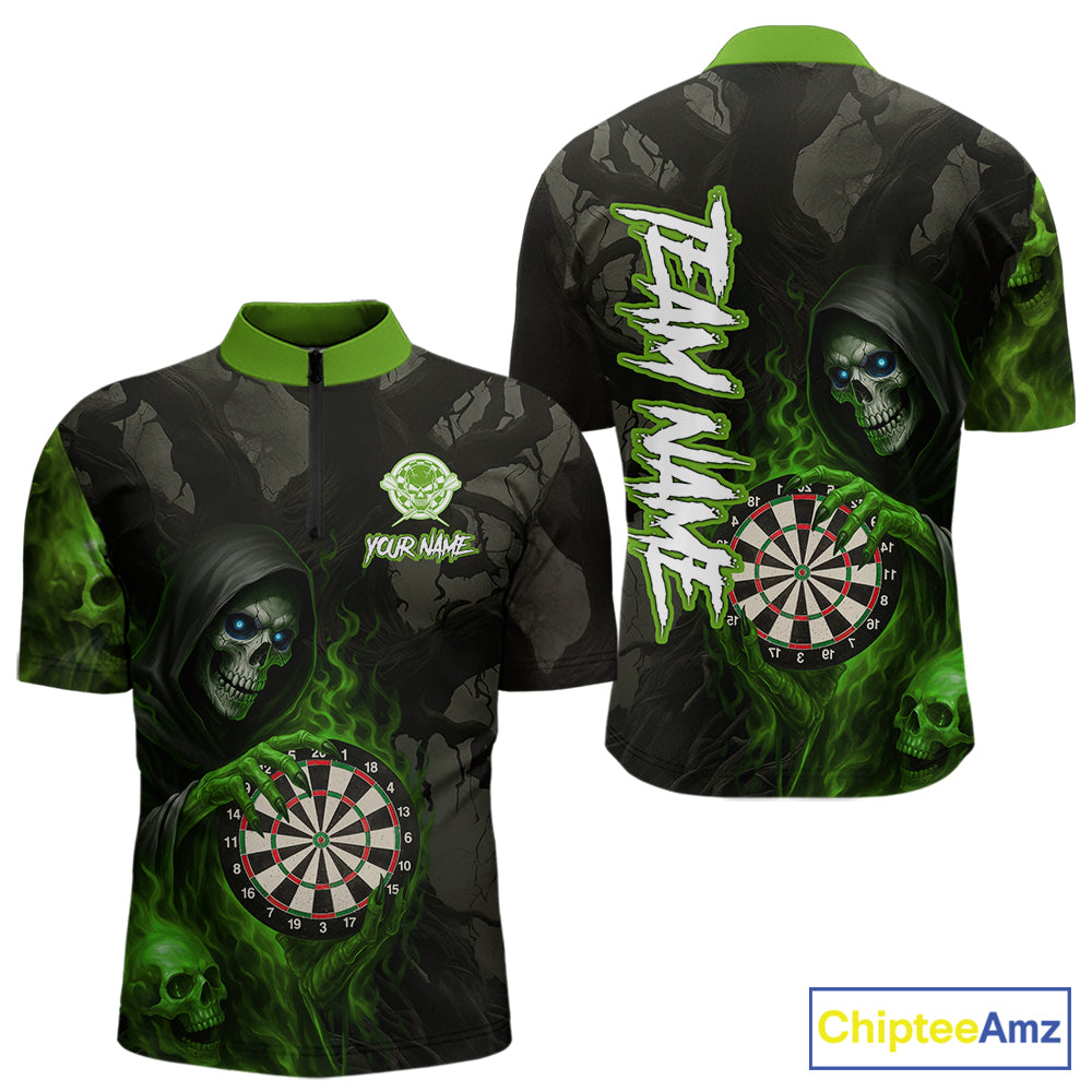Green Grim Reaper Flame Darts Shirt For Men Custom Skull Darts Jersey Team Polo & Quarter Zip TDM5531