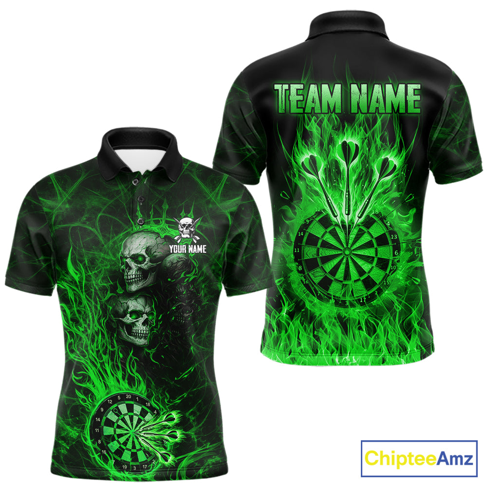 Green Flaming Skull Darts Polo & Quarter Zip Custom Fire Darts Shirt For Men, Darts Team Jersey TDM5621