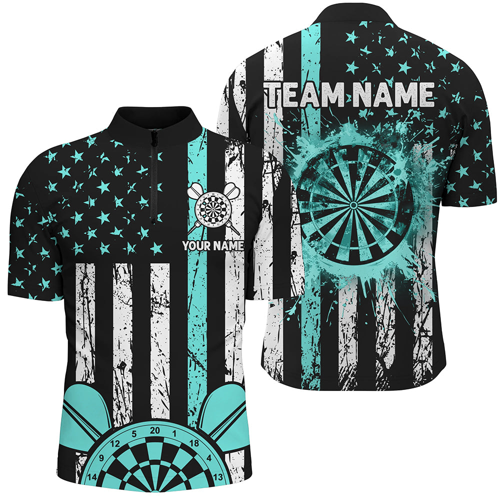 Custom Turquoise Grunge US Flag Patriotic Darts Shirts For Men, Darts Tournament Jersey Retro Style TDM2534