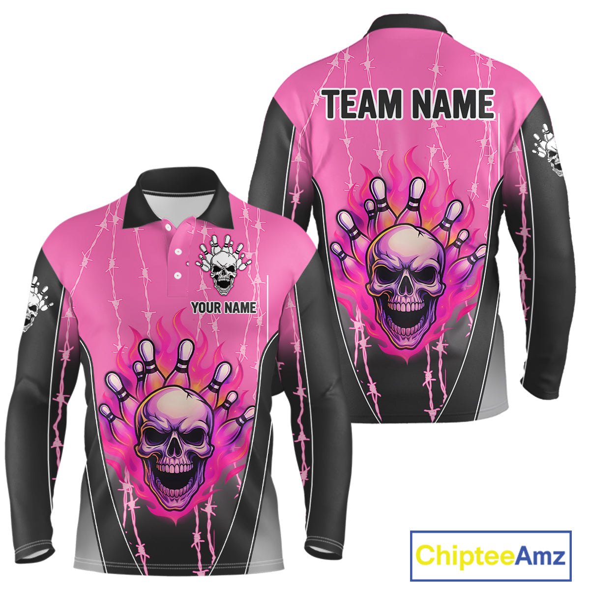 Black and pink flame skull Bowling Polo, 1/4 Zip Shirt for men Custom Team Bowling League Jersey NQS10203