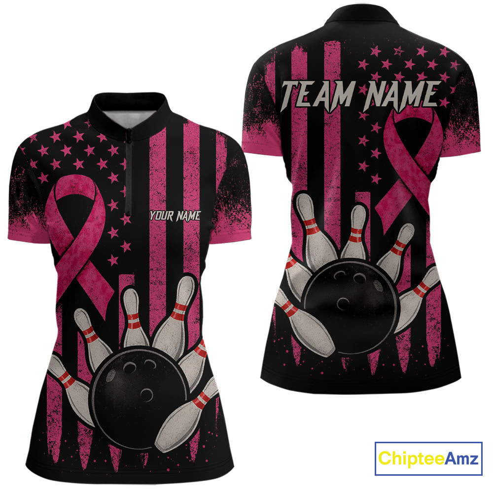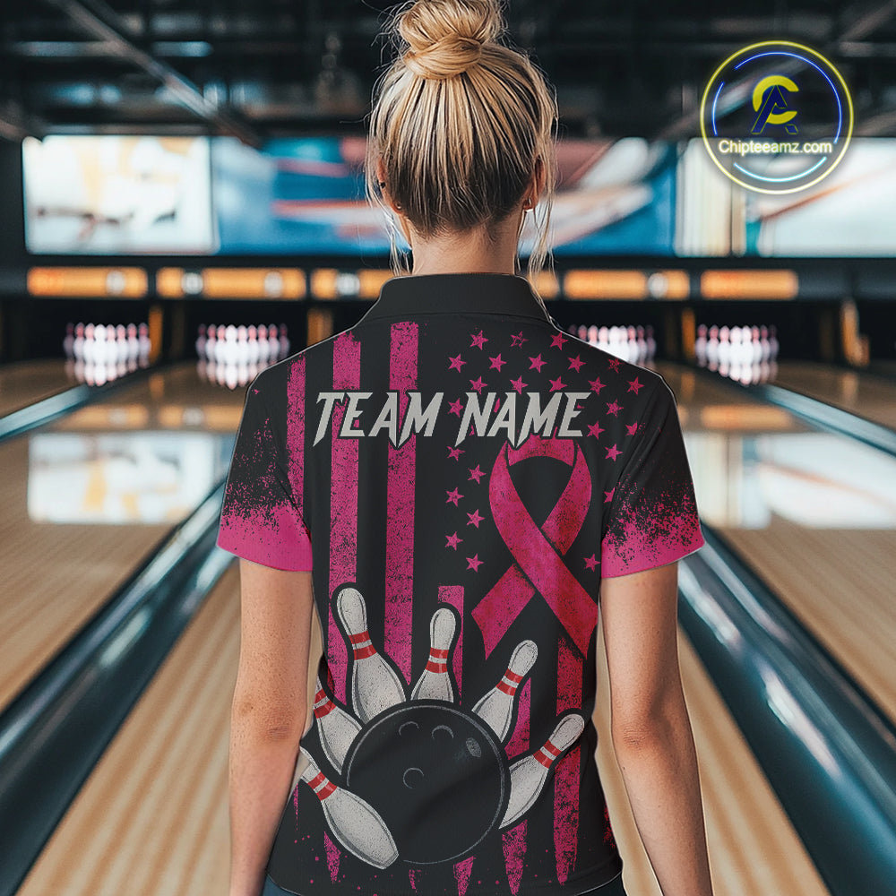 Black and Pink ribbon American Flag Breast Cancer Bowling Shirts For Women Custom Bowling Team Jerseys NQS9841
