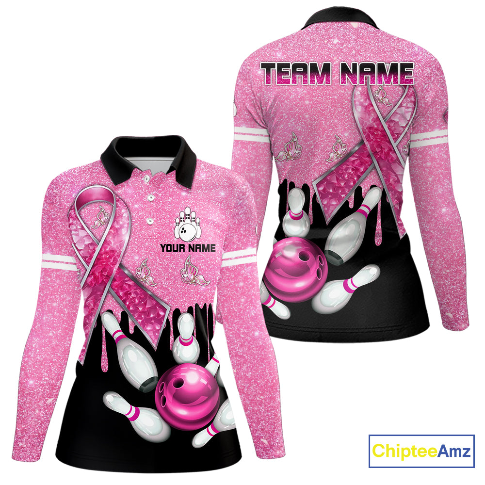 Black and Pink ribbon glitter Bowling Shirts For Women Custom breast cancer team bowling jerseys NQS9950