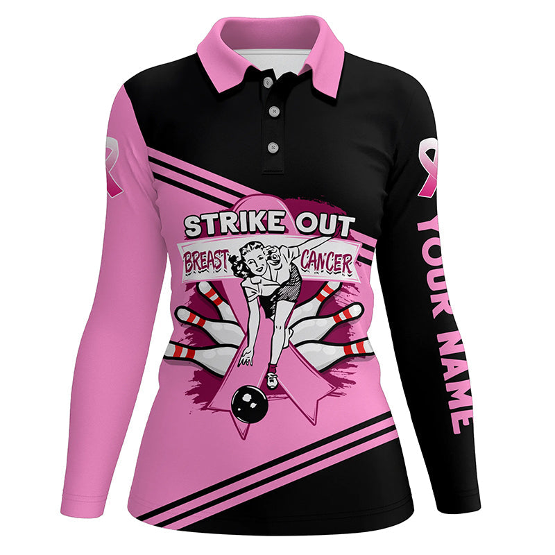 Pink Women bowling polo shirts Custom strike out breast cancer Bowling Team Jersey, bowling gift NQS6382