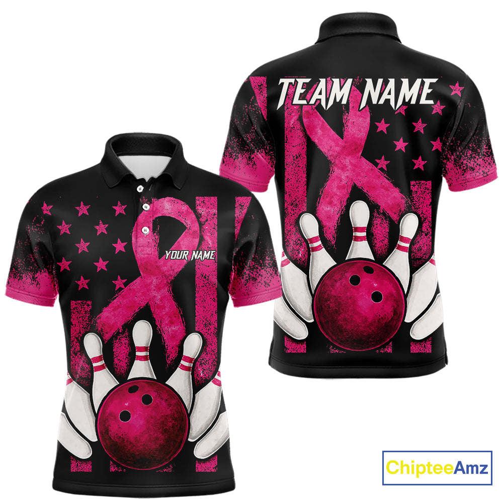 Breast Cancer Bowling Shirts For Men Custom Black and Pink ribbon American Flag Bowling Team Jerseys NQS9842