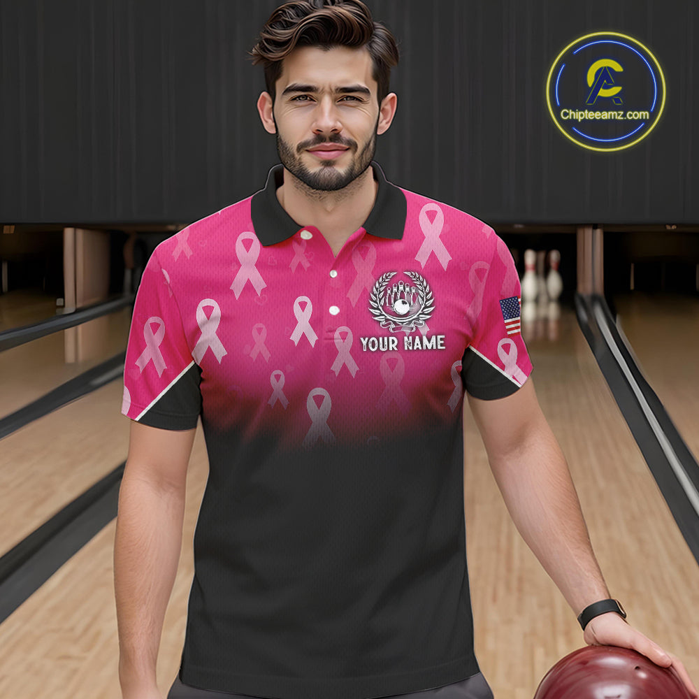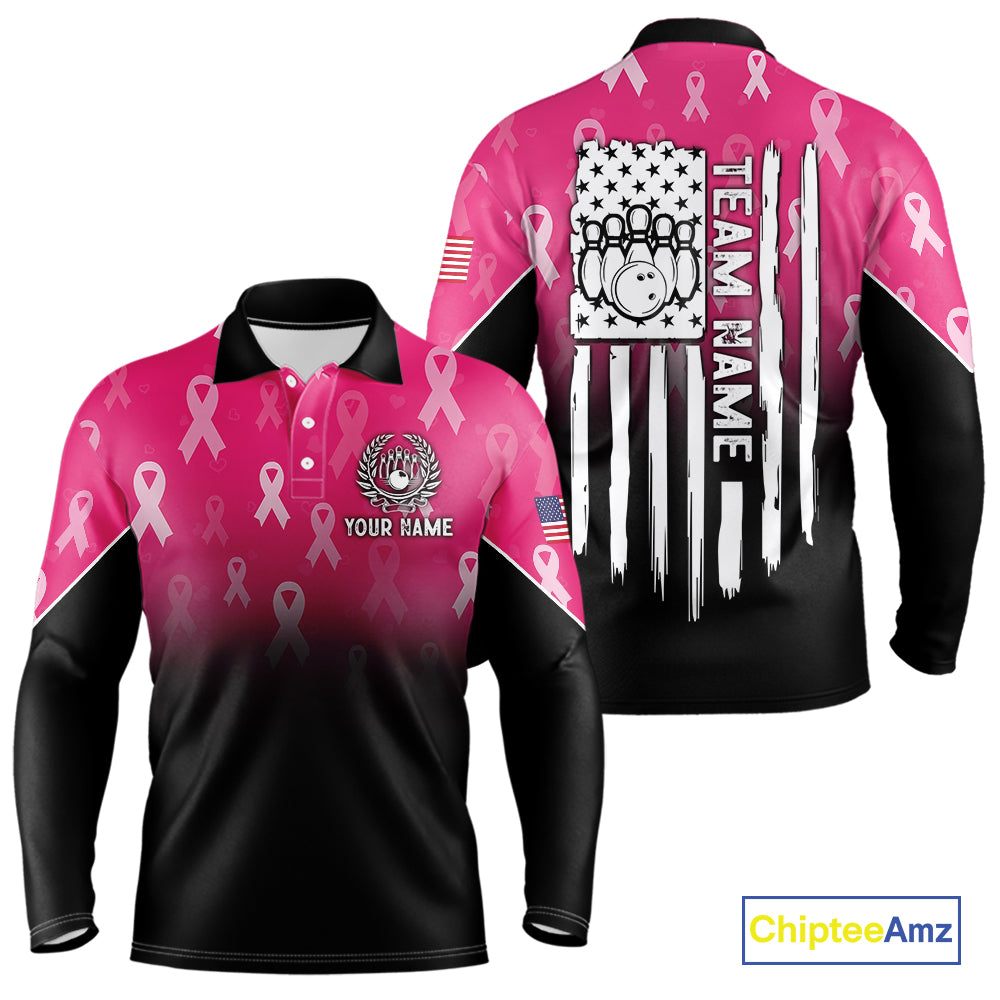 Custom American flag patriotic Pink ribbon breast cancer bowling shirt for men bowling team jersey NQS10413