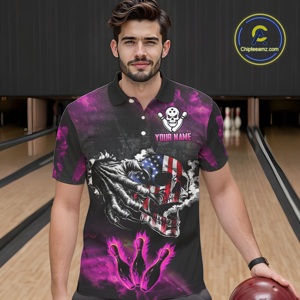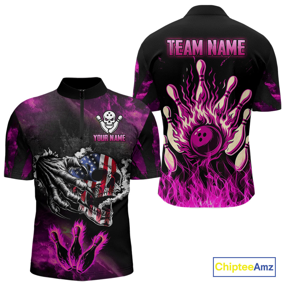 Pink Flaming American Flag Skull Bowling Shirt For Men Custom Fire Bowling Team Jersey TDM4751