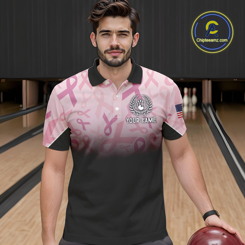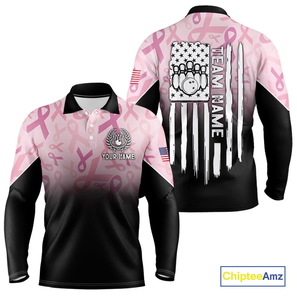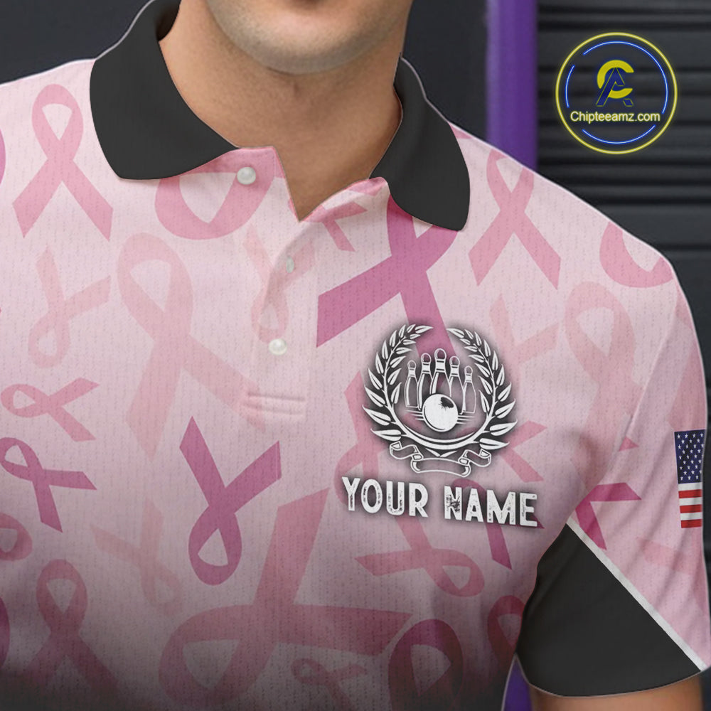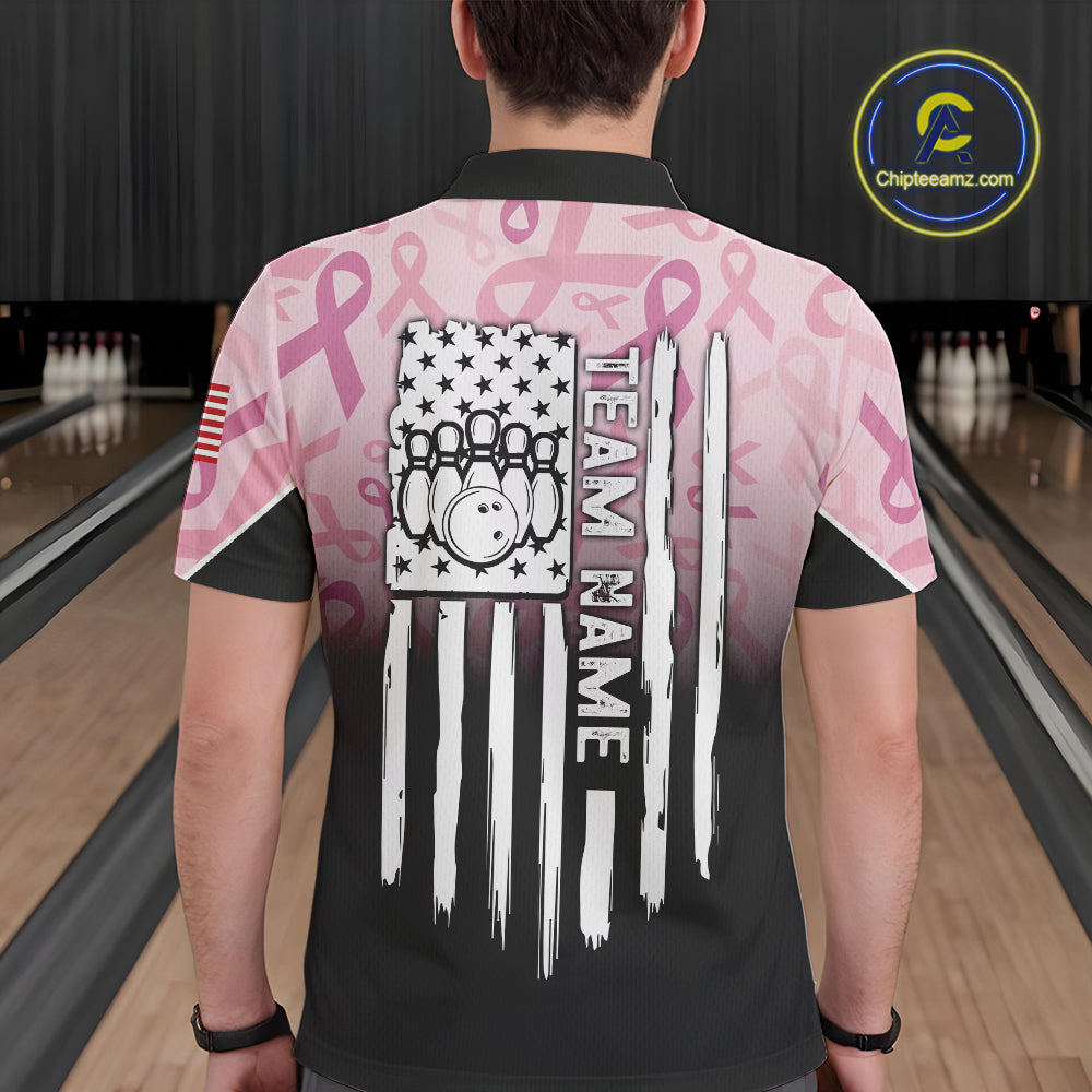 Mens bowling shirt Custom American flag patriotic Pink ribbon breast cancer bowling team jersey NQS10412