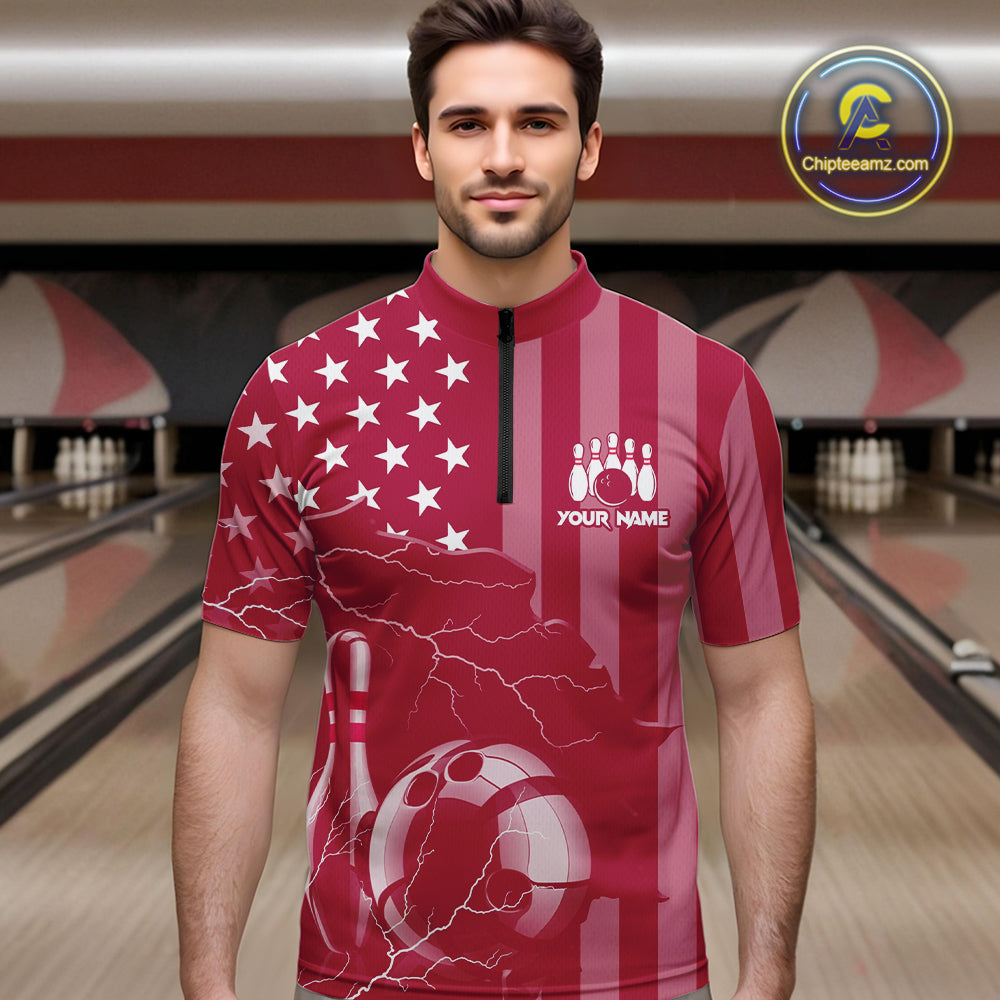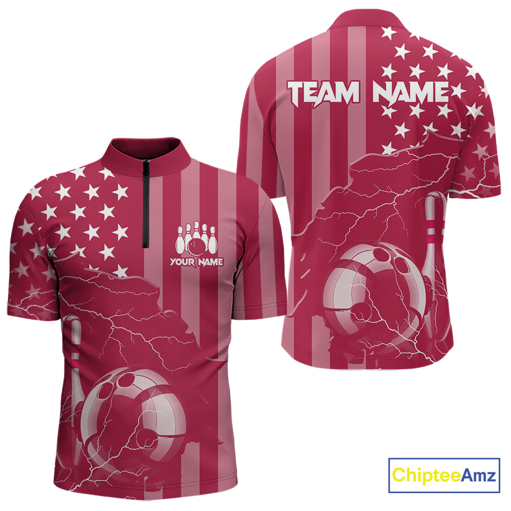 Personalized Pink American flag Lightning thunder Custom Bowling Team Shirts For Mens Bowling Jersey NQS10488