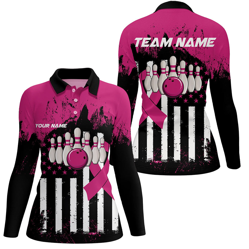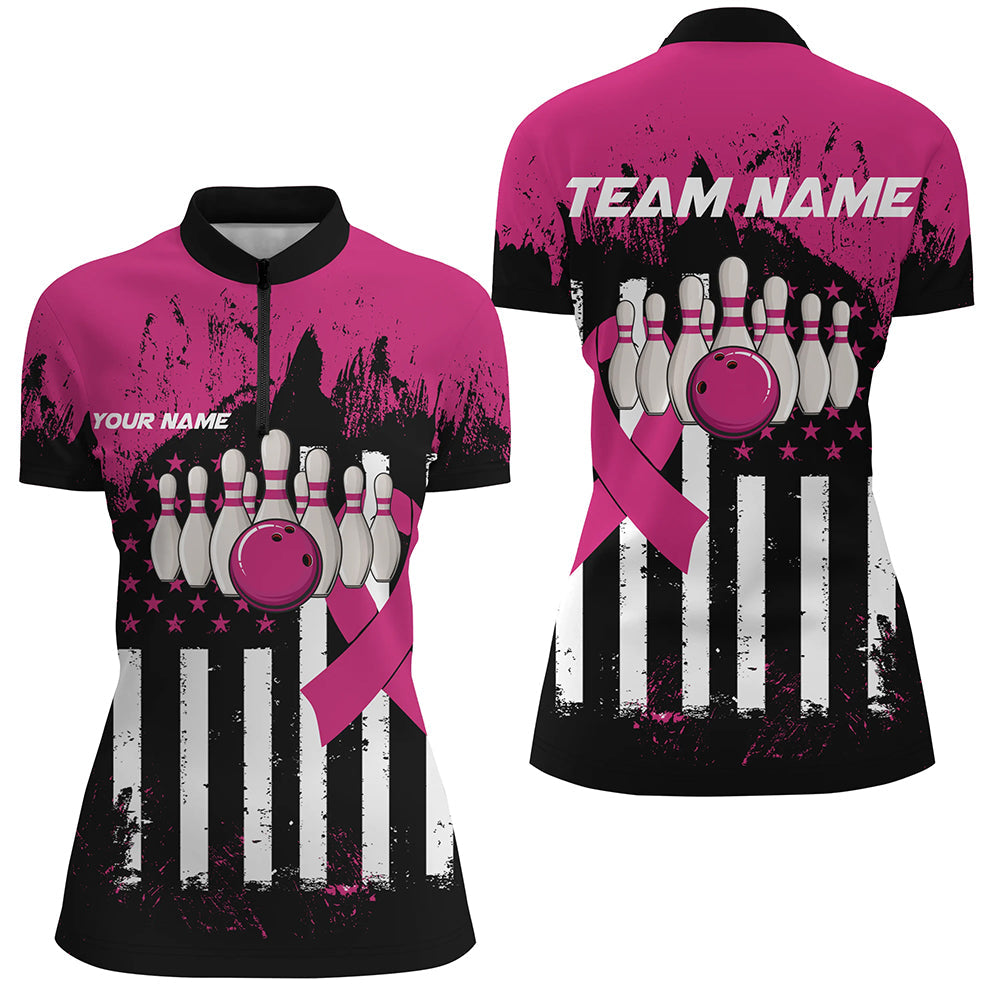 Pink and Black American flag Women Polo, 1/4 Zip Shirts Custom Breast Cancer Awareness bowling jerseys NQS8102