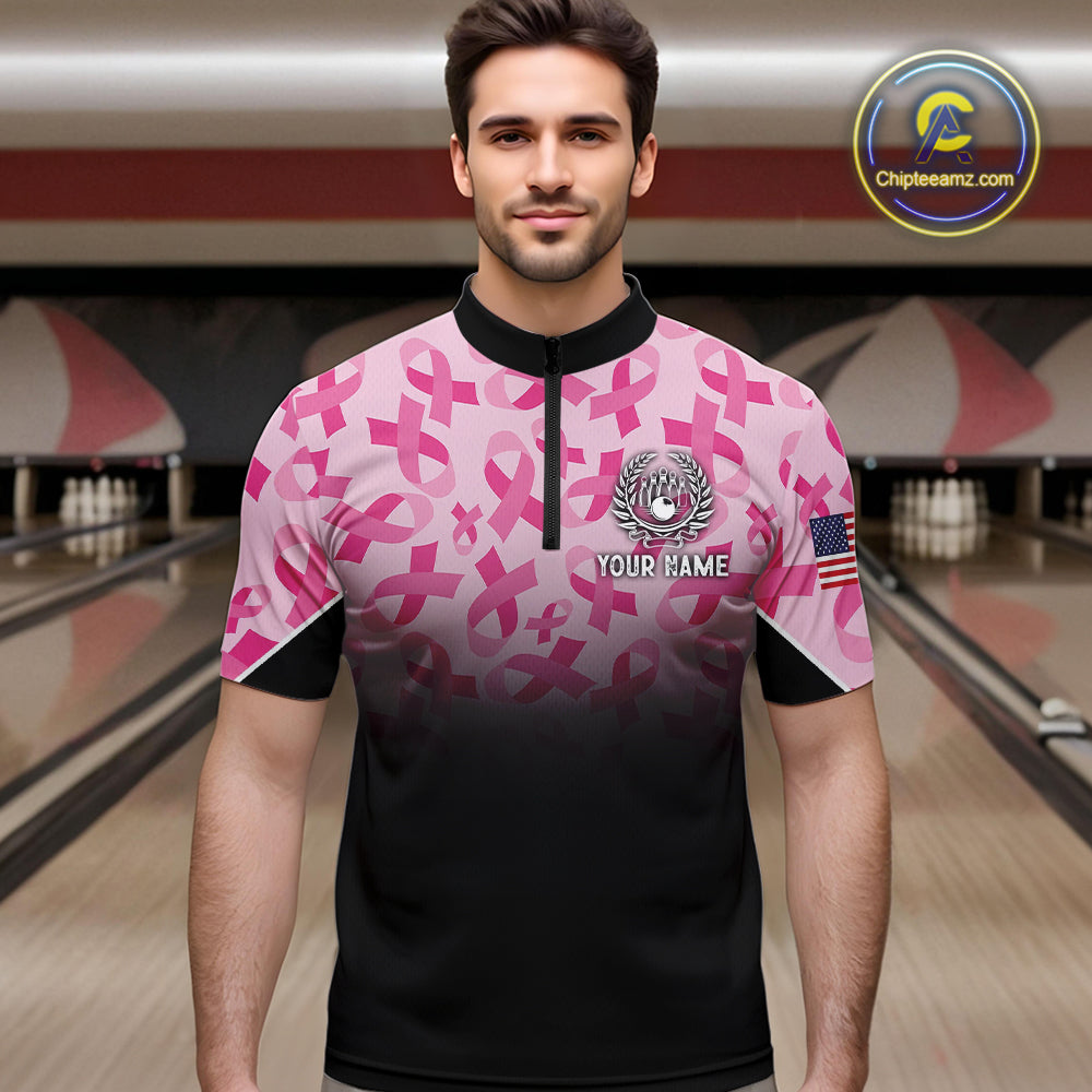 Pink ribbon pattern Men bowling shirt Custom American flag patriotic breast cancer bowling team shirt NQS10411