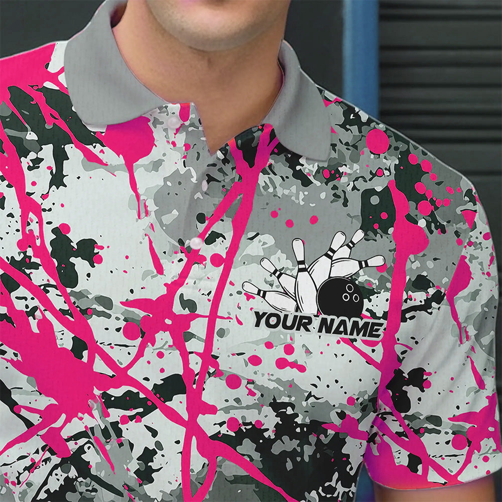 Custom Pink Splatter Bowling Team Polo Shirts For Men, Bowling Tournament Shirts IPHW8309