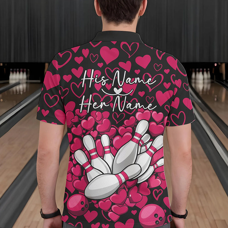 Black And Pink Heart Theme Custom Valentines Bowling Polo Shirt For Men, Couple Bowling Shirt IPHW8337