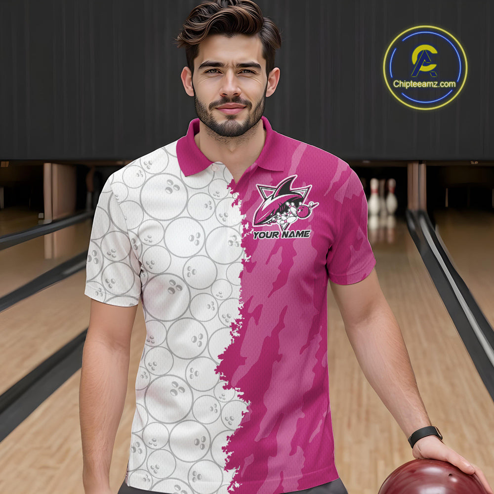 Custom White And Pink Shark Bowling Polo Shirts For Men, Shark Bowling League Shirt IPHW8992