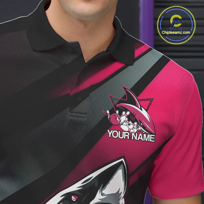 Custom Black And Pink Shark Bowling Jerseys, Bowling Team Uniform Shark Men Polo Shirts IPHW9001