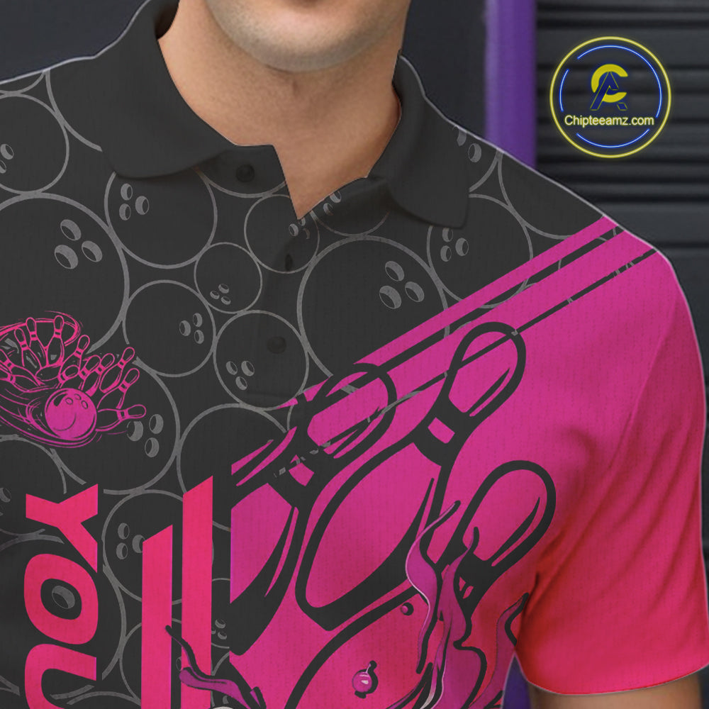 Custom Black And Pink Purple Flame Bowling Polo Shirts For Men, Bowling Pattern Shirt IPHW9272