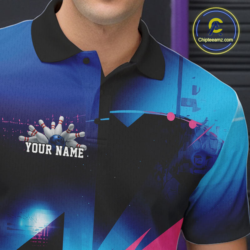 Custom Blue And Pink Futuristic Bowling Polo Team Shirts For Men, Bowling League Shirt IPHW9513