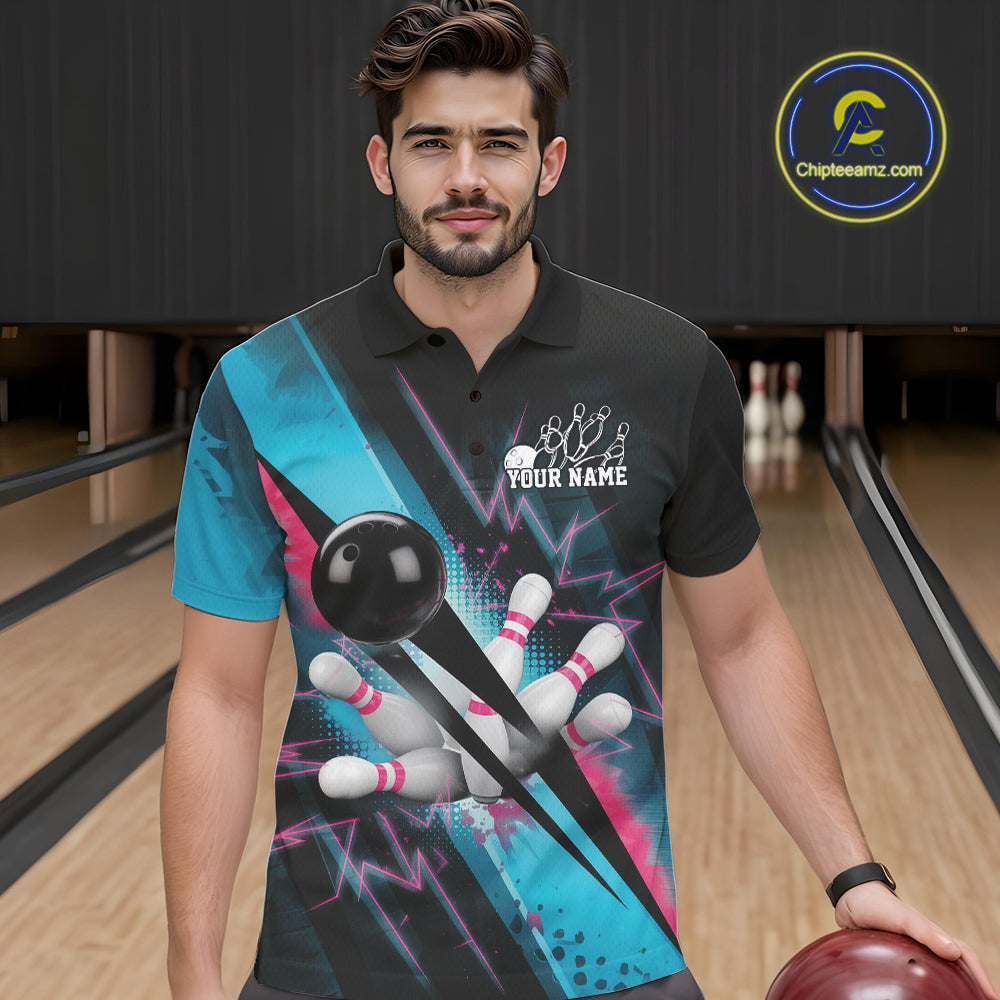 Custom Blue And Pink Synthwave Style Bowling Polo Shirts For Men, Team Bowling League Shirt IPHW9514
