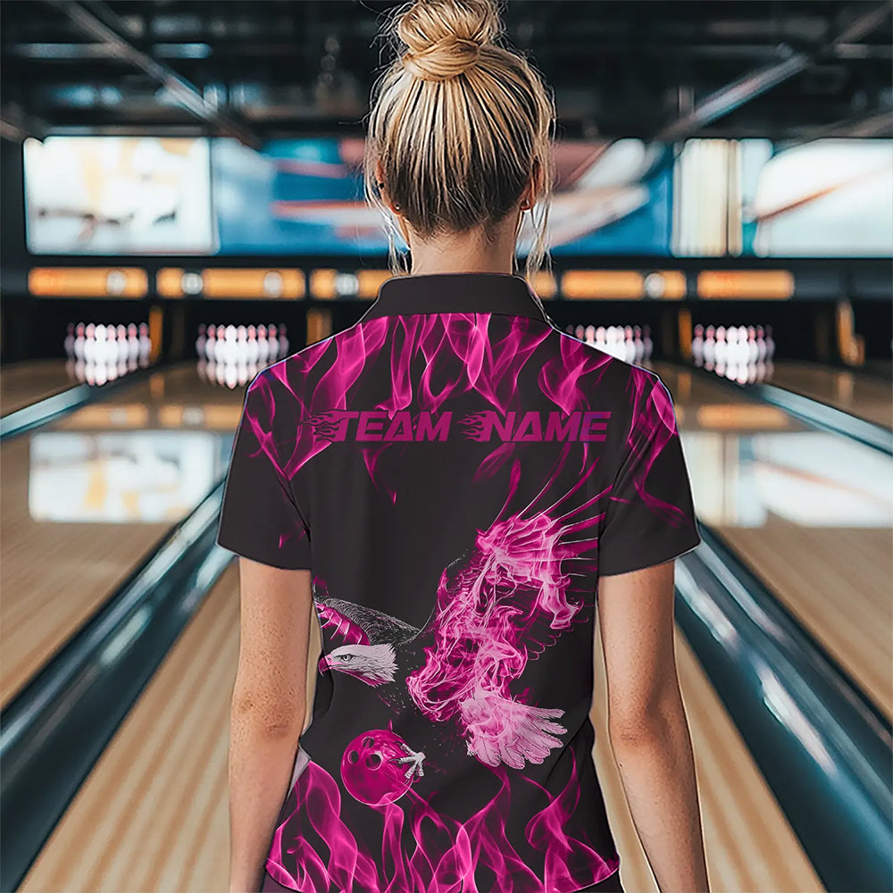 Custom Black And Pink Flame Eagle Bowling Team Women Polo Shirt, Eagle Bowling League Shirt IPHW8791