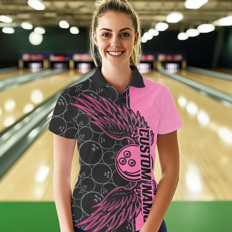Black And Pink Custom Bowling Tournament Women Polo Shirts, Bowling Ball And Wings Jerseys IPHW8848