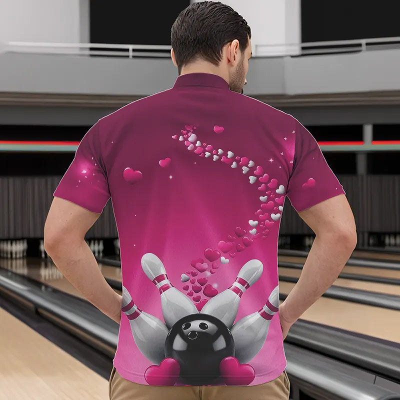 Pink Heart Theme Custom Valentines Bowling Quarter-Zip Shirts For Men, Couple Bowling Shirt IPHW8347